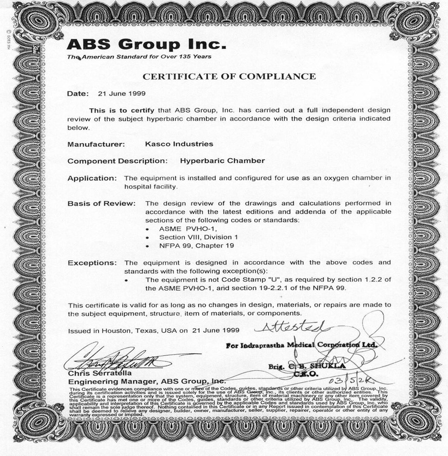 Certificate of Compliance from ABS Conforming to ASME-PVHO I & NFPA Standards